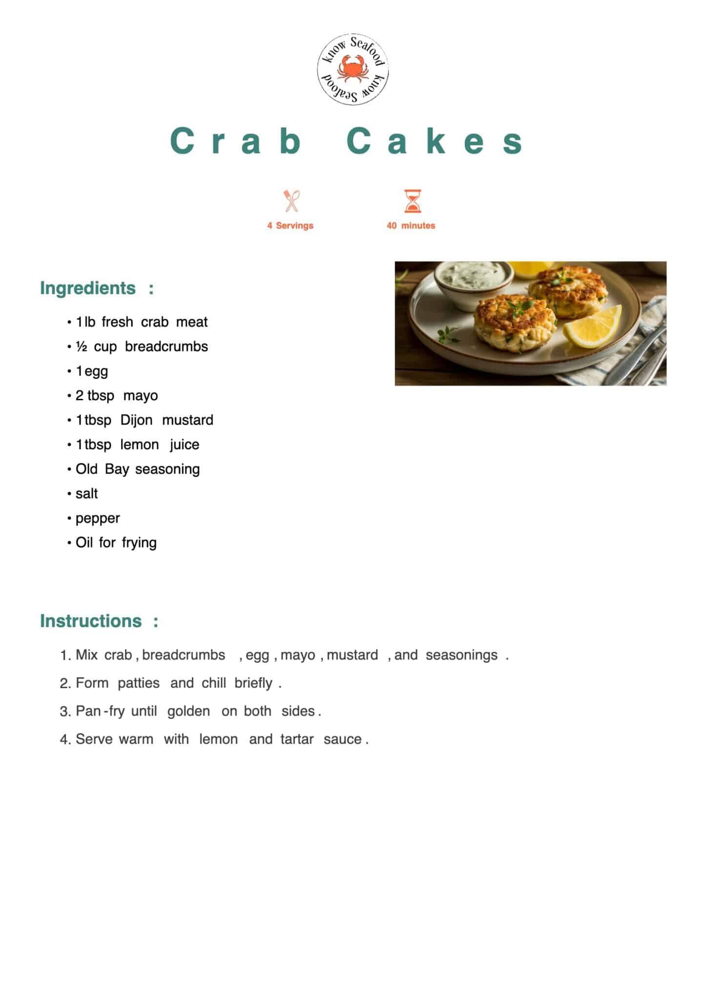 The key is to use fresh crab and not too much filler, then serve with lemon wedges and tartar sauce on the side.