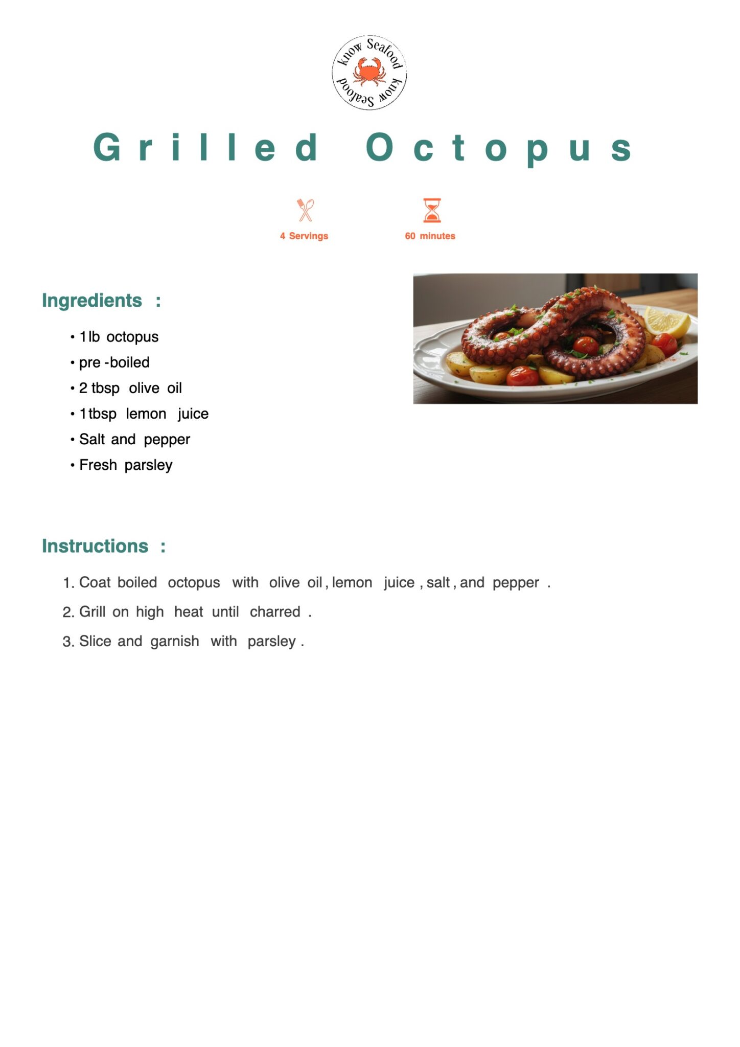 Tender octopus grilled with olive oil and lemon, developing charred edges that add incredible smoky flavor to the meat underneath, it should be boiled first to make it tender.